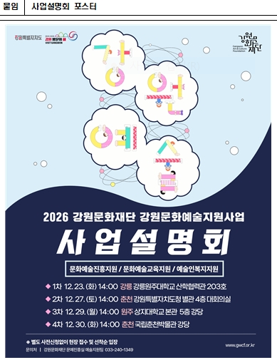 강원문화재단(대표이사 신현상)은 2026년 강원문화예술지원사업의 주요 내용과 변경사항을 도민에게 안내하기 위해 춘천·원주·강릉 등 3개 권역에서 총 4회에 걸쳐 통합 사업설명회를 개최한다.이번 설명회는 강원문화재단의 예술지원팀·예술교육팀·강원예술인복지지원센터의 사업을 한자리에서 소개하며, 창작지원·교육지원·예술인복지지원