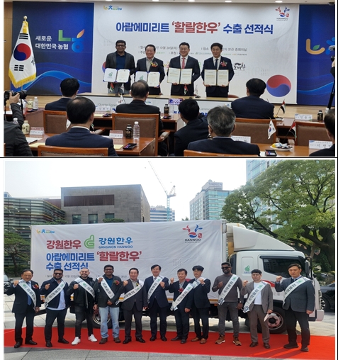 대한민국 축산물 브랜드경진대회에서 2019년, 2021년, 2023년 대통령상을 수상한 강원특별자치도 통합브랜드 ‘강원한우’가 10월 30일(목) 서울 농협중앙회 본관에서 ‘강원한우 아랍에미리트(UAE) 수출 선적식’을 개최했다.○ 이날 행사에는 농림축산식품부, 강원특별자치도, 농협중앙회, 수출 관련 기관 등이 참석했으며