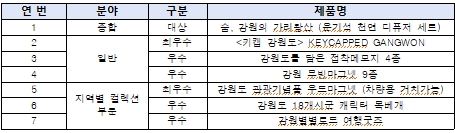 대상을 포함한 총 7팀의 수상팀에게는 총 600만 원의 상금과 함께 ‘강원 방문의 해’ 공식 기념품으로 활용될 수 있는 혜택이 주어진다.