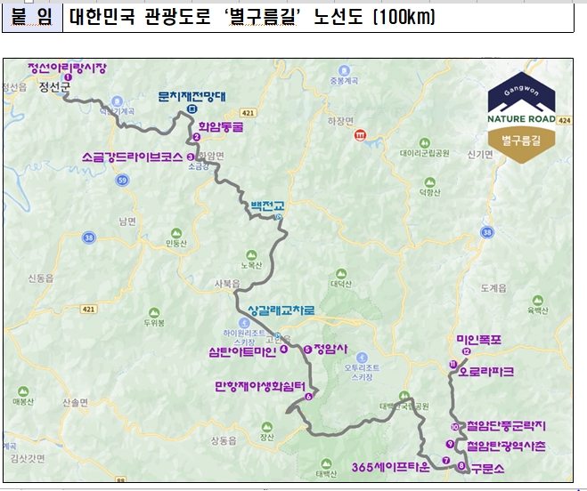 □ '별 구름길'은 정선아리랑시장에서 시작해 화암동굴, 만항재, 구문소, 철암탄광역사촌, 미인폭포까지 이어지는 약 100km 구간으로 폐광지역의 산업 유산과 자연‧지질 자원을 하나의 관광루트로 연계한 점에서 높은 평가를 받았다.