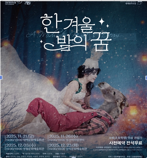 강원특별자치도는 문화 소외지역인 폐광지역 주민의 문화예술 향유 기회를 확대하고, 청소년 문화 격차를 해소하기 위해 2025년 폐광지역 찾아가는 문화예술공연 연극 「한 겨울밤의 꿈」을 폐광지역 4개 시군에서 총 8회 개최한다.