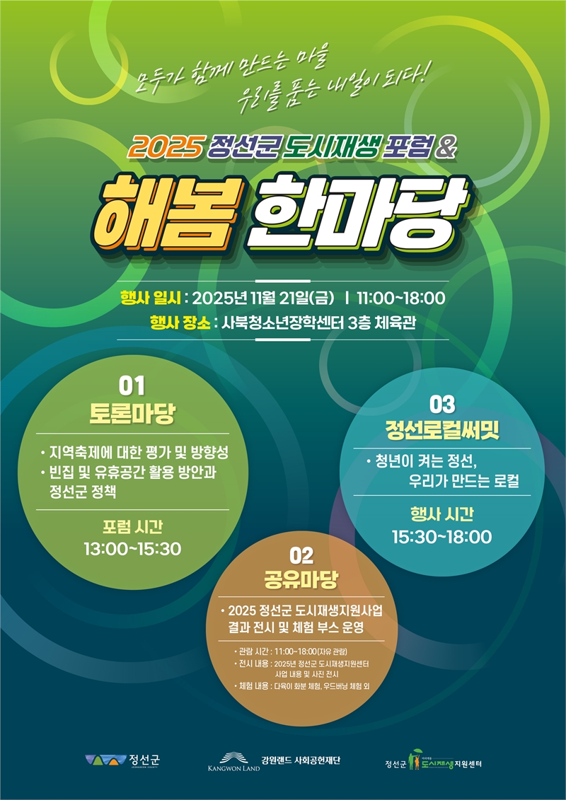 정선군도시재생지원센터는 오는 2025년 11월 21일 사북청소년장학센터에서 '2025 도시재생포럼 및 해봄한마당'를 개최한다. 이번 행사는 도시재생의 성공적인 추진 방안을 모색하고, 주민 참여를 통한 지역 활성화를 도모하기 위해 마련되었다.