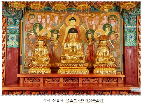 - 삼척 신흥사 대웅전에 주불로 봉안되어 있는 석조석가여래삼존좌상은 본존에 석가여래불, 좌우협시는 보살상으로 구성되어 있다.