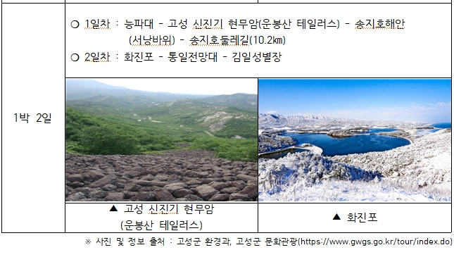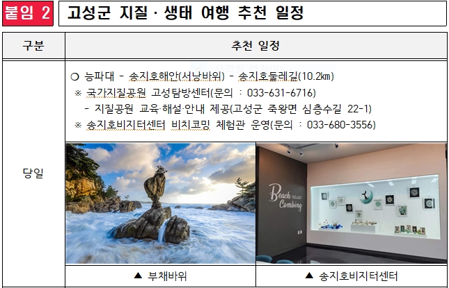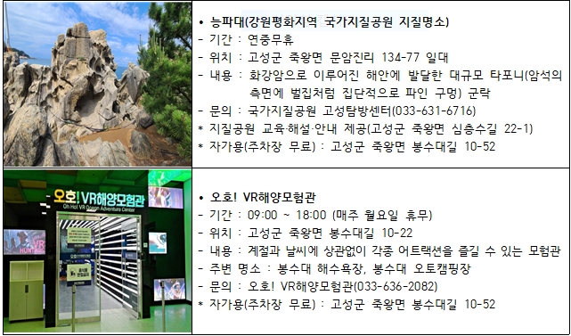 ○ 또한 △능파대(강원평화지역 국가지질공원 지질명소)는 벌집 모양의 타포니가 대규모로 발달한 해안지형으로, 서낭바위와 함께 고성 해안의 지질·지형학적 다양성을 보여주는 대표 명소다. △오호!VR해양모험관은 기상과 계절의 제약 없이 즐길 수 있는 스포츠·체험 콘텐츠를 제공해 가족 단위 관광객에게도 높은 인기를 얻고 있다.