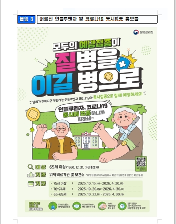 도는 현재 생후 6개월~13세 어린이, 임신부, 65세 이상 어르신*을 대상으로 2025~2026절기 인플루엔자 국가예방접종을 지원하고 있으며, 지역 접종률**은 목표치(어르신 81.5% 등)보다 낮은 접종률을 보이고 있어 도민의 안전하고 건강한 겨울나기를 위해 적극적인 예방접종 참여가 필요한 실정이다.