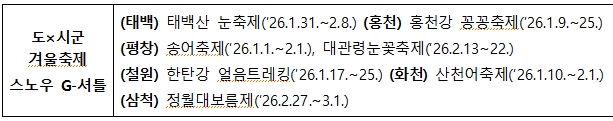 개별 해외 관광객(FIT)의 편의를 위해 '외국인 스노우 G(Gangwon)-셔틀 관광상품'을 운영한다. 수도권에서 도내 겨울 축제장 및 지역 전통시장을 쉽고 편리하게 연결하는 이 셔틀을 통해 해외 관광객들은 화천 산천어축제, 평창 송어축제 등 도내 주요 겨울 축제(6개 시군 7개 축제)를 방문하여 얼음낚시, 눈조각 관람 등 이색적인 겨울 체험을 즐길 수 있다.