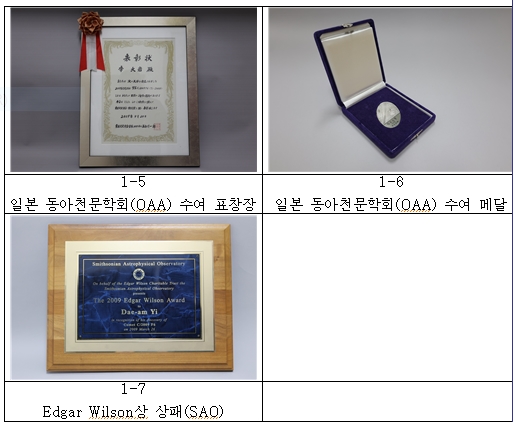 특히 90년의 역사를 지닌 일본 동아천문학회로부터 외국인으로는 처음으로 수여한 상장과 메달, 국제천문연맹(IAU)이 아마추어 천문가에게 수여하는 ‘에드거 윌슨상’ 상패도 함께 등록되었다.