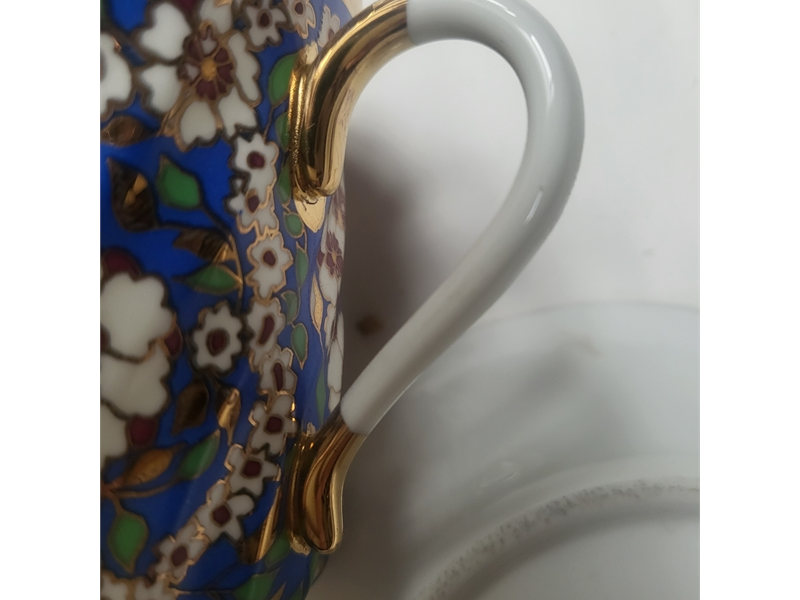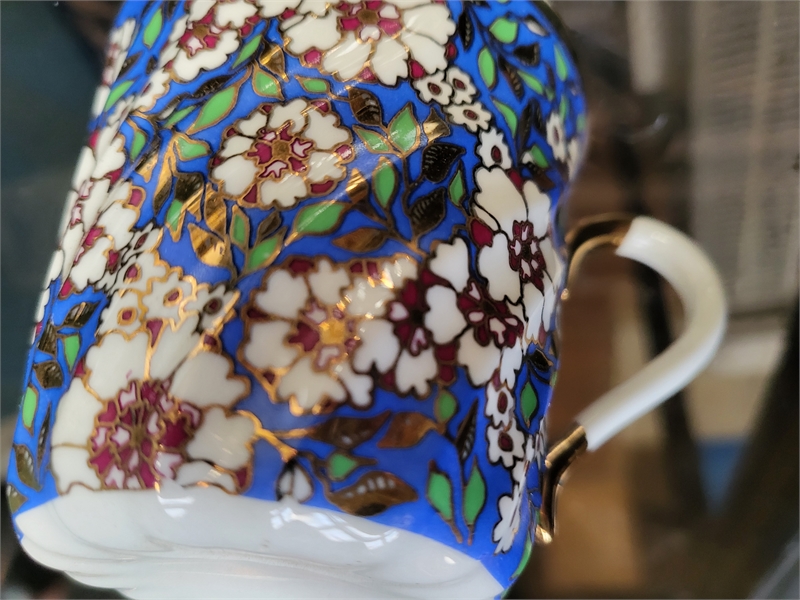 근거: 강한 코발트 블루 바탕. 두터운 금채 + 다색 에나멜. 커피 문화가 일본에 본격 확산된 시기.