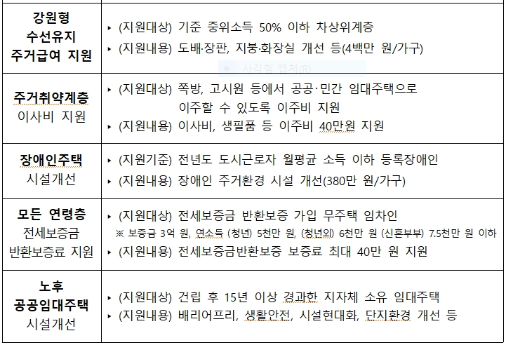 ⇨ 도배・장판, 보일러, 지붕・화장실 개선 등 가구당 최대 4백만 원 지원