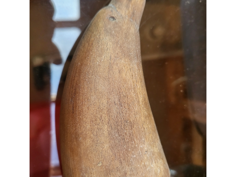 🔍 형태 및 재질 분석형태: 새의 부리와 머리 부분이 사실적으로 표현되어 있으며, 눈에 해당하는 작은 구멍이 있습니다. 이런 형태는 주로 지팡이 손잡이, 가구 손잡이, 혹은 민속 공예 장식품으로 사용되었습니다. 재질: 표면 질감과 색상으로 볼 때 **단단한 하드우드(예: 티크, 월넛, 마호가니 등)**로 조각된 것으로 보