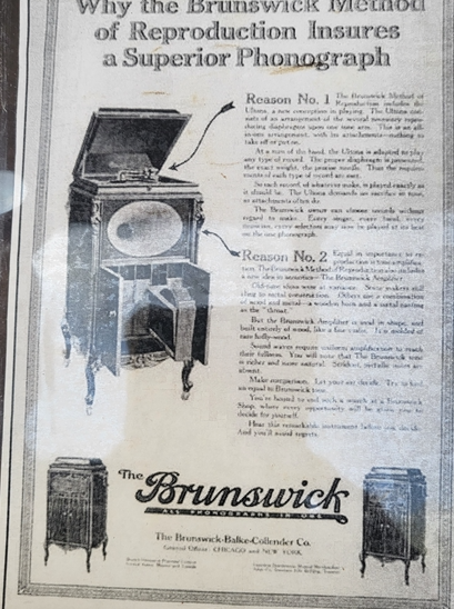 1919년경 The Brunswick-Balke-Collender Company(브런즈윅 발케 콜렌더사)가 제작한 브런즈윅 축음기*(Brunswick Phonograph. 실물은 길이가 너무 길어 카메라에 담기 곤란해 광고 전단지로 대체했습니다. 광고 전단지 원본은 The Ladies’ Home Journal 1919년